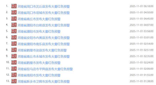 商丘市气象台2025年11月01日04时45分将大雾橙色预警信号升级为大雾红色预警信号:预计今天凌晨至上午,我市市区及所辖乡镇和街道将出现能见度小于50米的雾,并将持续。请注意防范。