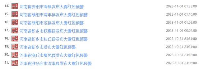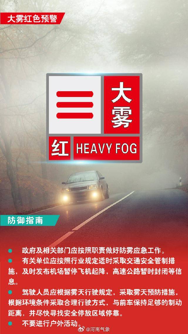 据中国天气网消息,昨夜至今晨,河南已有多地发布大雾红色预警。