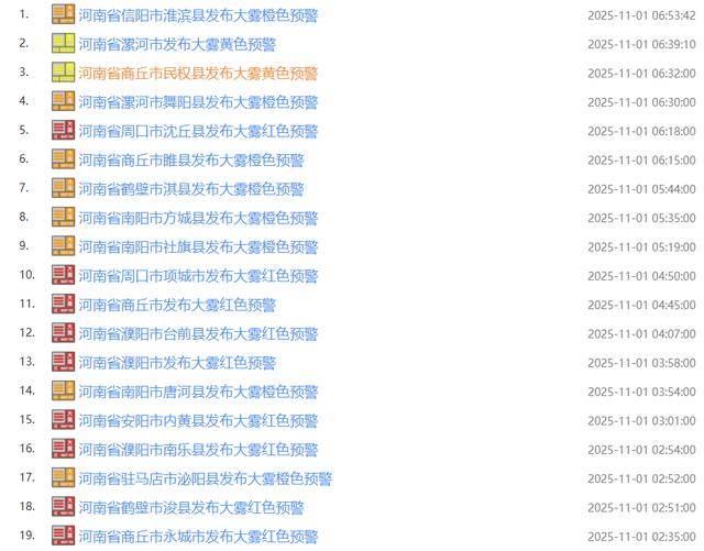 记者从河南气象了解到,漯河、商丘、濮阳等地已陆续发布大雾预警信号,截至7:20,河南75条预警生效中。