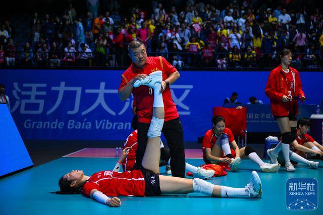 ↑ 河南队球员朱婷(前)在场边做拉伸。