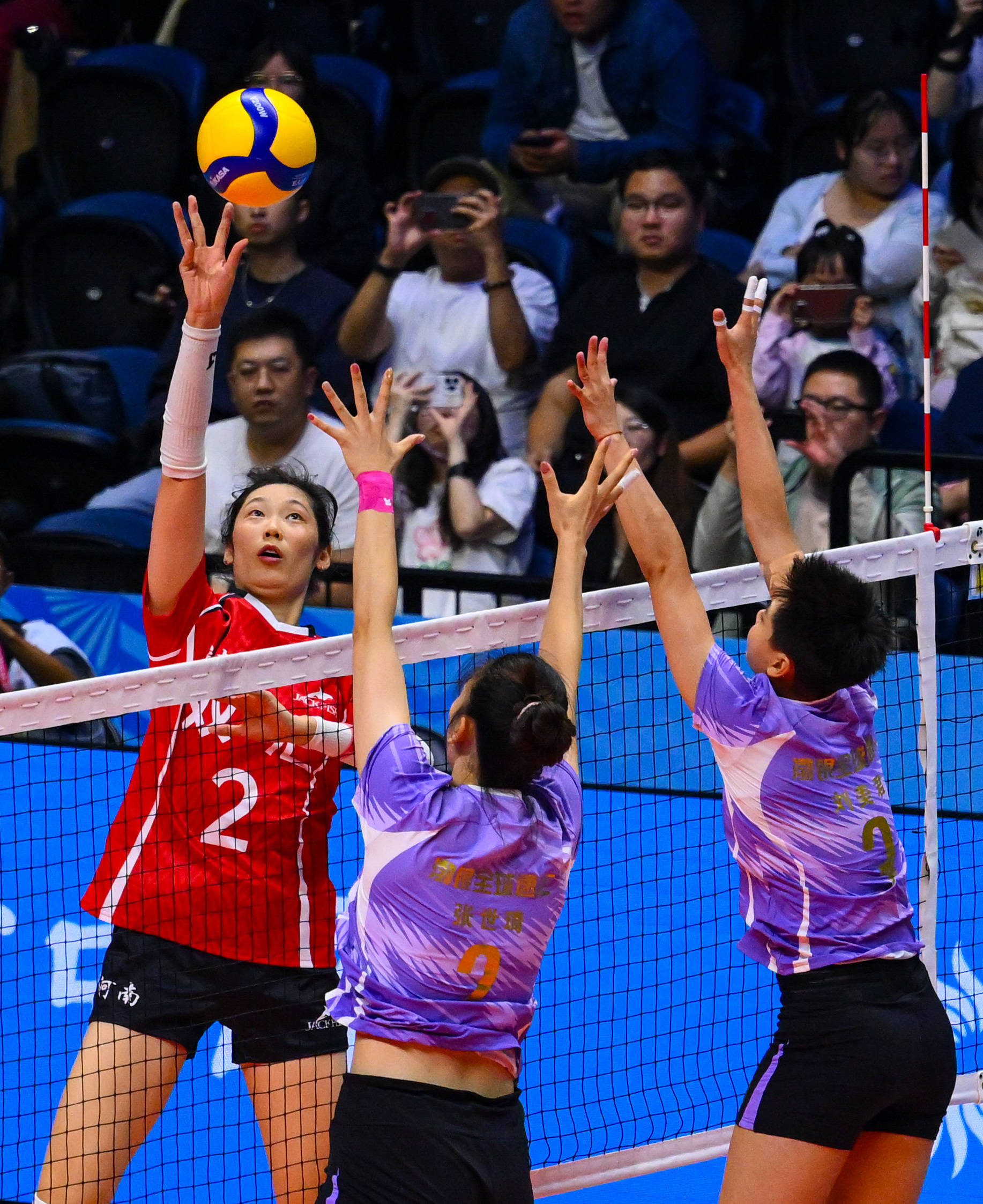 11月7日,河南队球员朱婷(中)在比赛中进攻。 新华社发(张金加 摄)
