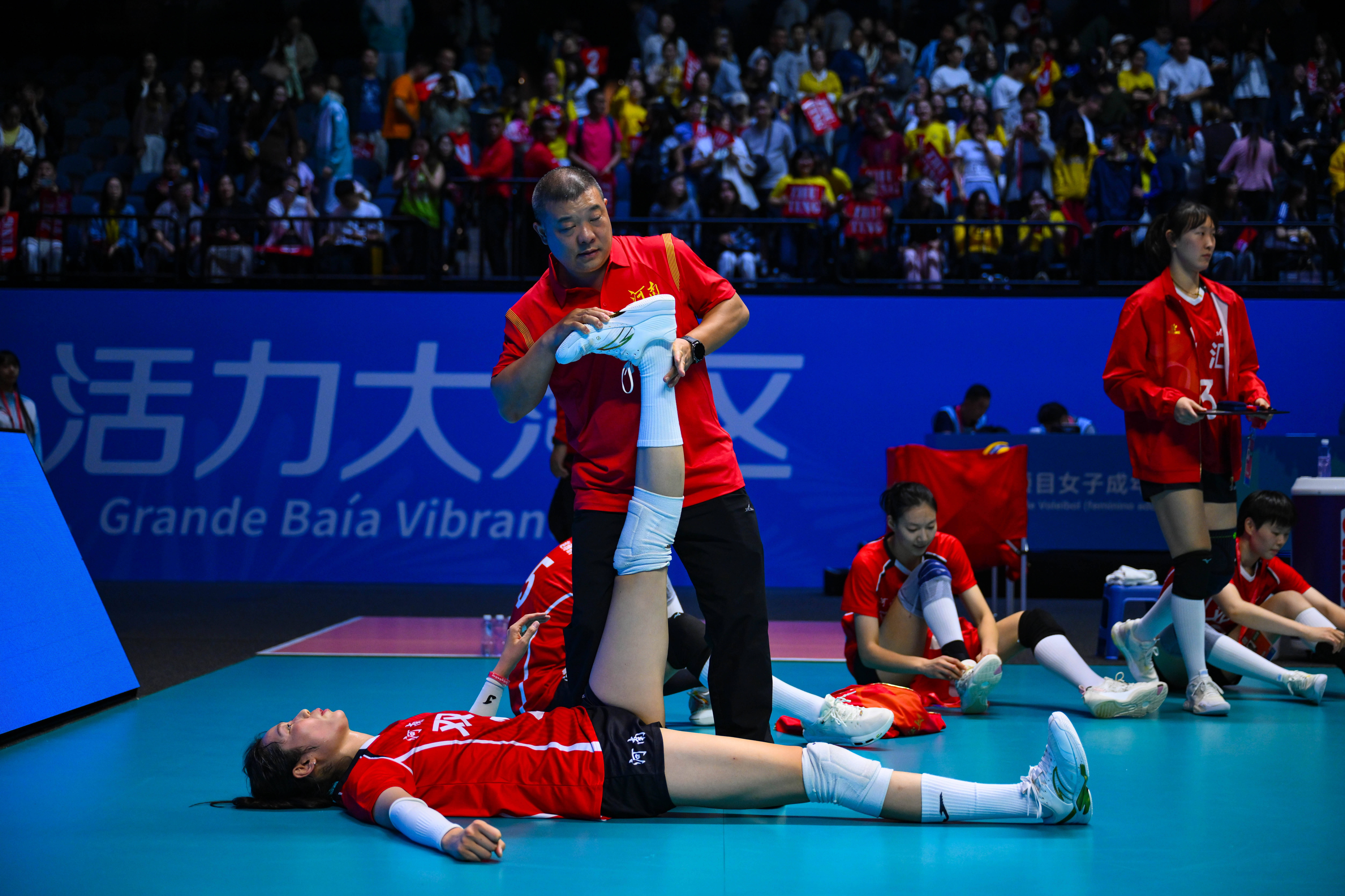 11月7日,河南队球员朱婷(前)在场边做拉伸。 新华社发(张金加 摄)