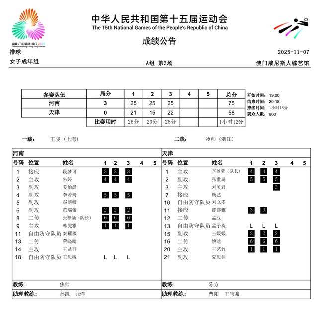 11月7日晚,第十五届全运会女排成年组A组焦点战在澳门威尼斯人综艺馆落幕,朱婷领衔的河南女排以3-0(25-21、25-15、25-22)完胜卫冕冠军天津女排,斩获小组赛开门红,爆出赛事一大冷门。