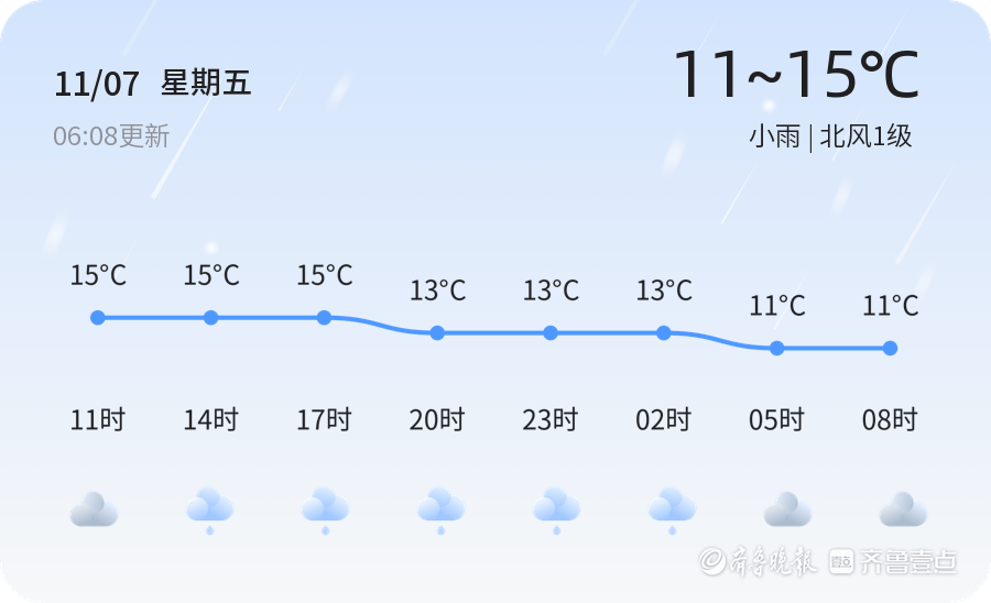 明天是11月8日,星期六,聊城天气仍为小雨,气温较今日稍有上升,预计在11℃至16℃之间。风力保持在北风1级,市民需继续关注天气变化,及时添衣保暖。