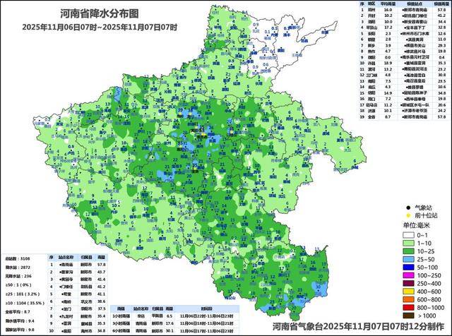 省气象台监测显示,11月6日7时至7日7时,全省大部出现小到中雨,新乡、三门峡、洛阳、郑州、开封、平顶山、许昌、信阳等地部分县(市、区)局部出现大雨,新郑青岗庙局地暴雨。全省平均降水量8.7毫米,地市平均降水量位列前三的分别为:许昌18.9毫米、平顶山17.2毫米、郑州16.0毫米。降水量位列前三的分别为:新郑市青岗庙57.8毫米、新郑市苗家沟43.7毫米、新密市黄固寺41.4毫米。此外,安阳、郑州、平顶山、许昌、南阳、信阳等地部分县(市、区)出现最低能见度小于等于500米,局地最低能见度小于等于200米。最低能见度前三站分别为:嵩山26米、鸡公山149米、林州204米。