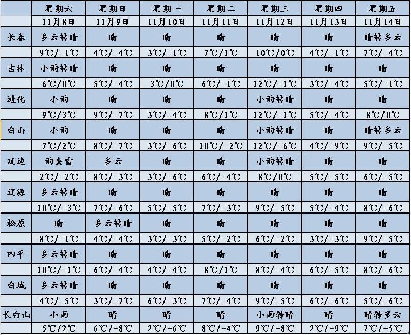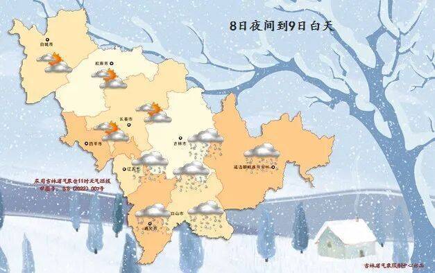 今天夜间到明天白天,全省多云有时阴,白城、松原北部、延边州有小雪或雨夹雪,部分地方有小到中雪,其他地区有雨夹雪或小雨。