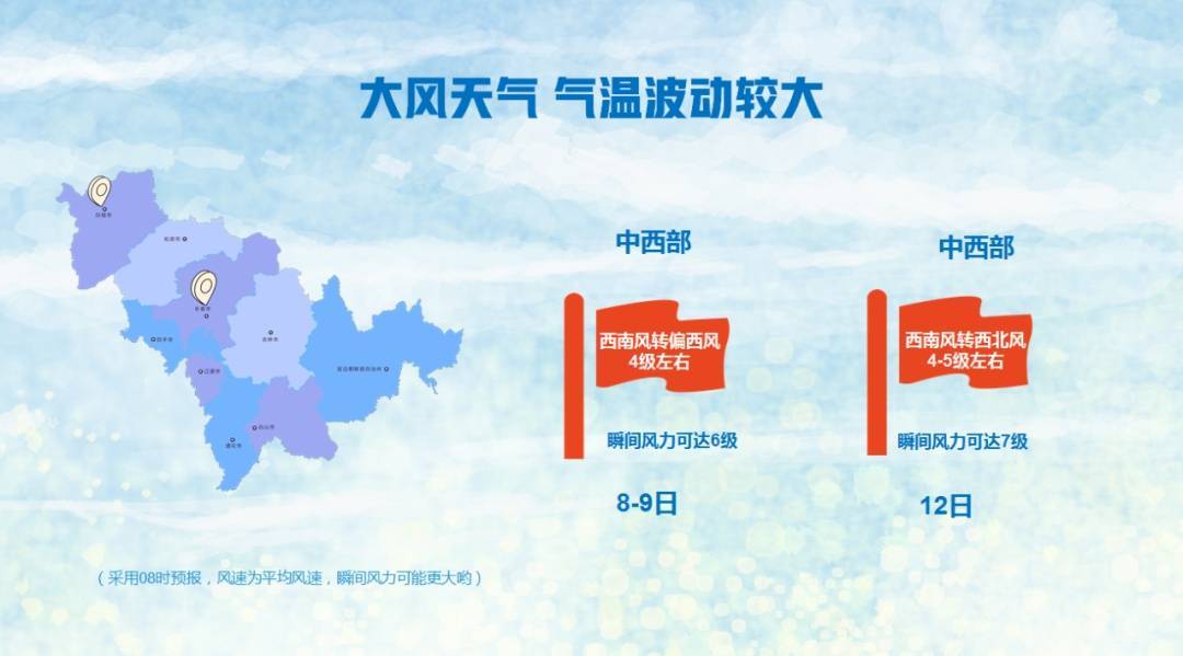 8—9日,我省中西部有4级左右西南风转偏西风,瞬间风力可达6级以上;12日,我省中西部有4-5级左右西南风转西北风,瞬间风力可达7级以上。