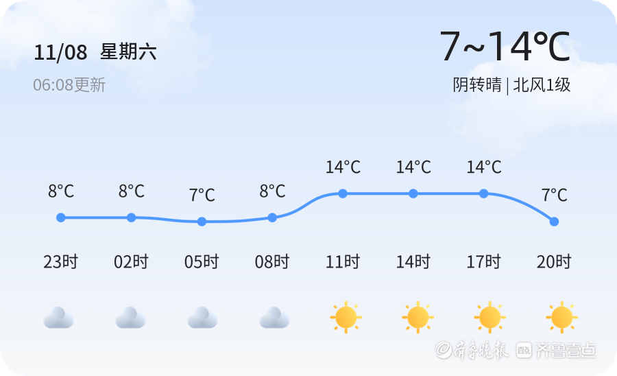 今天是11月8日,星期六,农历九月十九。德州今日天气以阴转晴为主,早晨气温较低,为7℃,白天最高气温可达14℃,北风1级,空气湿度较高,为95%。整体来看,德州各区天气情况基本一致,均为阴转晴,风力较小,适合户外活动。当前时间为0608,气温11.4℃,空气质量良好,PM2.5指数为73。