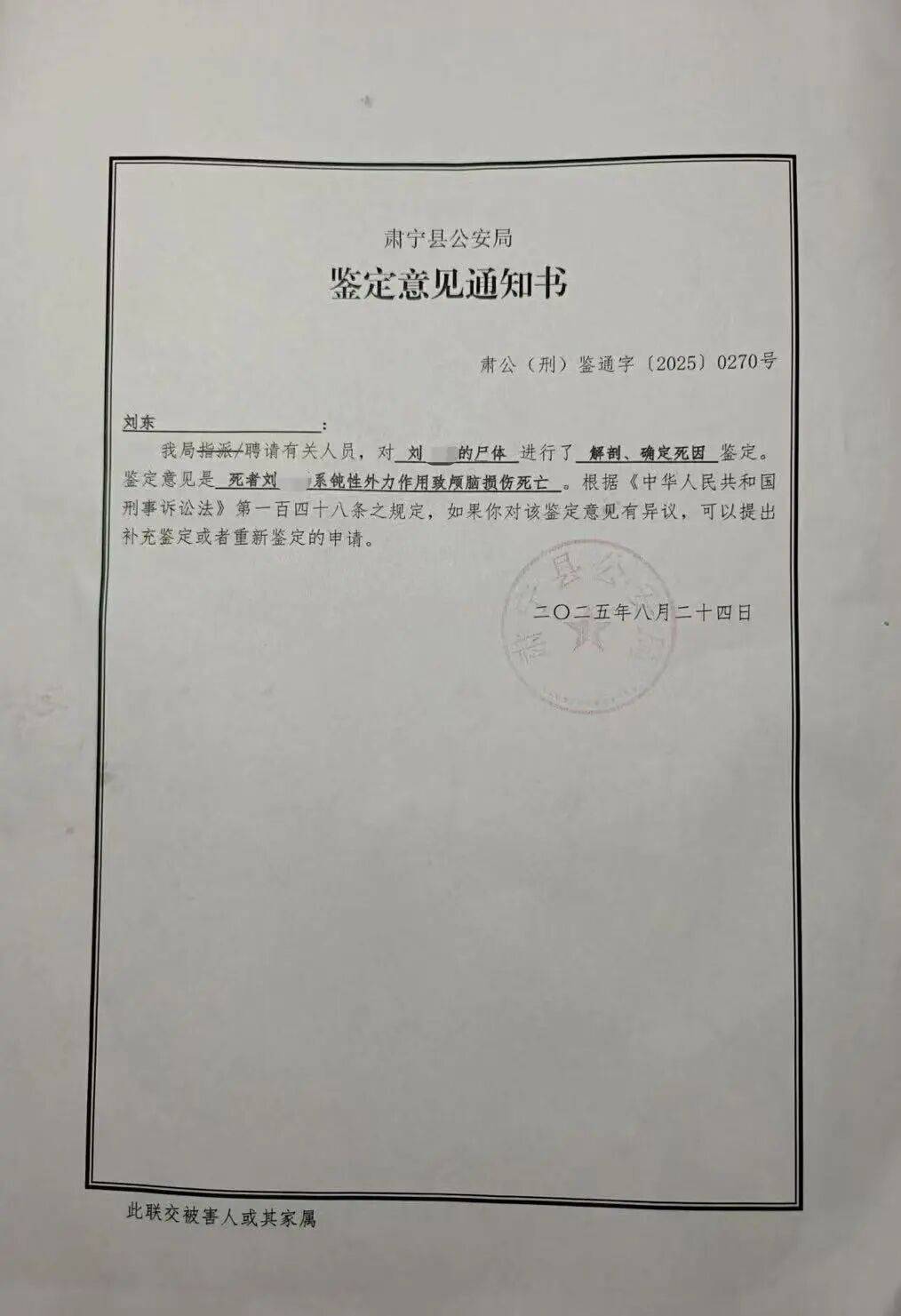 肃宁县公安局于8月24日出具的鉴定意见通知书显示,该局聘请有关人员,对刘某某的尸体进行了解剖、死因鉴定。鉴定意见是死者刘某某系钝性外力作用致颅脑损伤死亡。