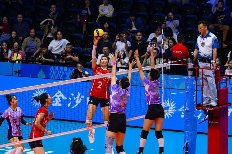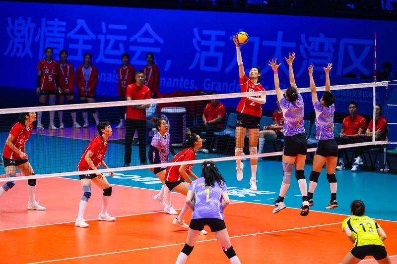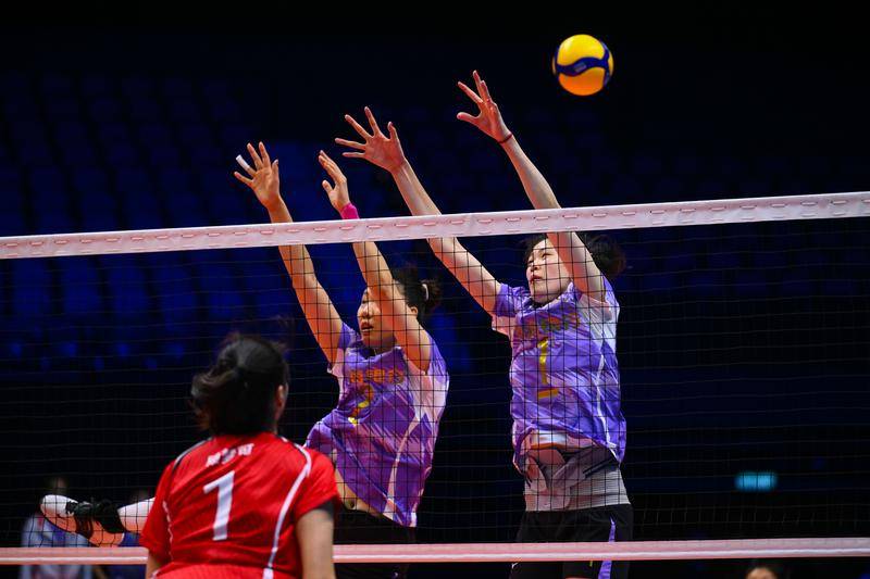 在澳门举行的第十五届全国运动会排球女子成年组小组赛A组比赛中,河南队3比0战胜天津队。新华社发(张金加 摄)