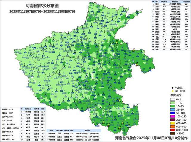 其中,11月7日7时至8日7时:全省大部出现小到中雨,信阳局部出现大雨。全省平均降水量8.8毫米,地市平均降水量位列前三的分别为:商丘14.1毫米、信阳12.9毫米、驻马店12.3毫米。降水量位列前三的分别为:商城县刘小坳32.7毫米、商城县汪桥31.9毫米、商城县汪岗25.9毫米。