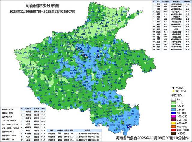 省气象台监测显示,11月6日7时至8日7时,全省大部降水量5毫米以上,沿黄及以南大部降水量10毫米到30毫米,郑州、开封、信阳局部降水量超50毫米。全省平均降水量17.5毫米,地市平均降水量位列前三的分别为:信阳27.9毫米、许昌26.9毫米、郑州25.7毫米。降水量位列前三的分别为:新郑市青岗庙77.4毫米、商城县刘小坳60.3毫米、新密市黄固寺60.3毫米。