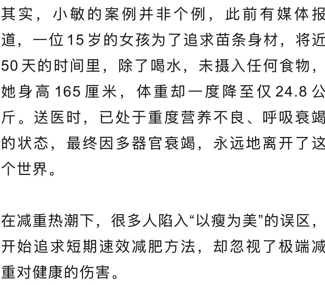 长此以往,小敏的BMI还不到18kg/m²,身体也亮起了“红灯”,每天没什么力气,只想躺在床上,体育课完全无法参与,月经也变得紊乱无常。