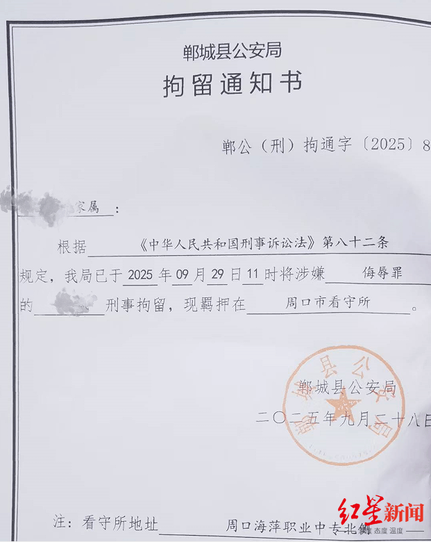 崔某甲告诉记者,自己嫂子杨某在距离2017年争执发生8年多后,于今年9月29日,被郸城县公安局以涉嫌侮辱罪刑事拘留。记者从郸城县公安局出具的拘留通知书上看到,杨某已被羁押在周口市看守所。此外,发生冲突时在场的崔某的表妹李某,也因涉嫌侮辱罪,在同一天(今年9月29日)被刑事拘留。