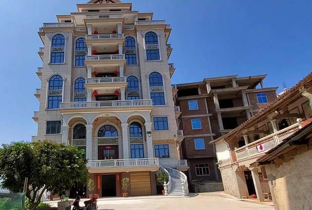 现在很多村民都跑到大城市去打工,几年之后也能省下一些钱。于是,这些村民就喜欢把赚来的钱用在盖新房子上面。而为了突出自己是当地有钱人,就一定要把房子盖出气势来。不仅是外墙贴满亮闪闪的瓷砖,大门也是雕龙画凤。而且别人盖房只建三四层,“假有钱人”却一定要盖五六层楼高的房子。而这样的房子从远处望去,那叫一个气派。