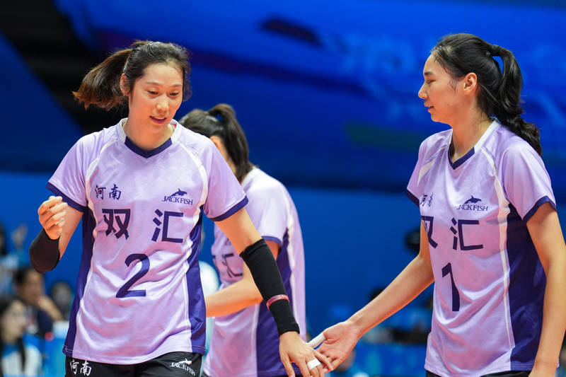 河南队球员赵博研、朱婷(右)在比赛中救球