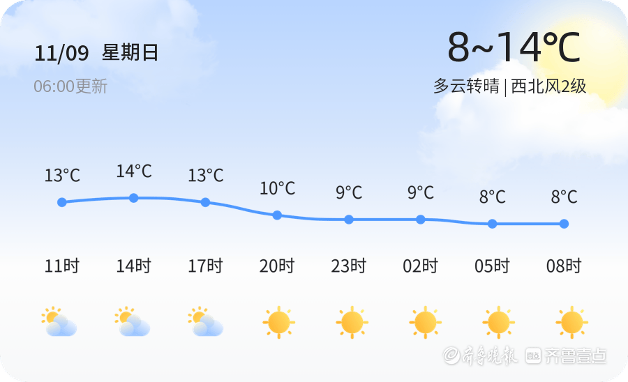 今天是11月9日,农历九月二十。青岛市今天天气多云转晴,气温在8℃到14℃之间,风力较小,整体天气状况较为舒适。各区天气情况基本一致,均为多云转晴,适合市民外出活动。明天,青岛市将迎来晴朗天气,气温稍有上升,最高气温将达到15℃,最低气温保持在8℃。与今天相比,风力有所增强,西北风4-5级,市民需注意防范大风带来的不便。未来三天,青岛市将持续晴好天气,气温相对稳定,最高气温在13℃到15℃之间,最低气温维持在8℃左右。风力方面,北风和南风交替出现,风力多为3-4级,市民出行时需注意防风保暖。特别提醒市民,风力较大的情况下,外出时请远离广告牌和树木,确保安全。温馨提示
