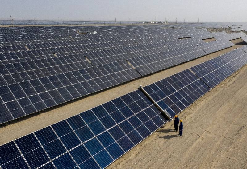 9月22日,工作人员在位于新疆巴音郭楞蒙古自治州若羌县的中国绿发新疆中绿电若羌400万千瓦光伏项目内巡视(无人机照片)。昔日的戈壁荒漠,如今由太阳能光伏板汇聚成“蓝色海洋”,由风力发电机组成“白色森林”,正孕育着无限“风光”。 新华社发