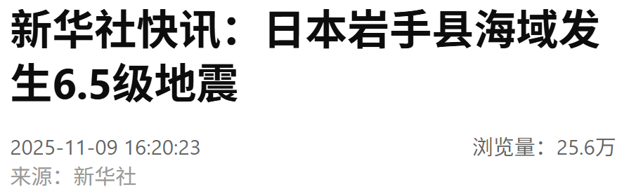 另据新华社消息,日本岩手县海域发生6.5级地震。日本气象厅随后发布了对日本东北地区的“海啸注意报”,预计岩手县局地可能出现最高约1米的海啸,请沿岸民众保持警惕,远离海岸和河口区域。