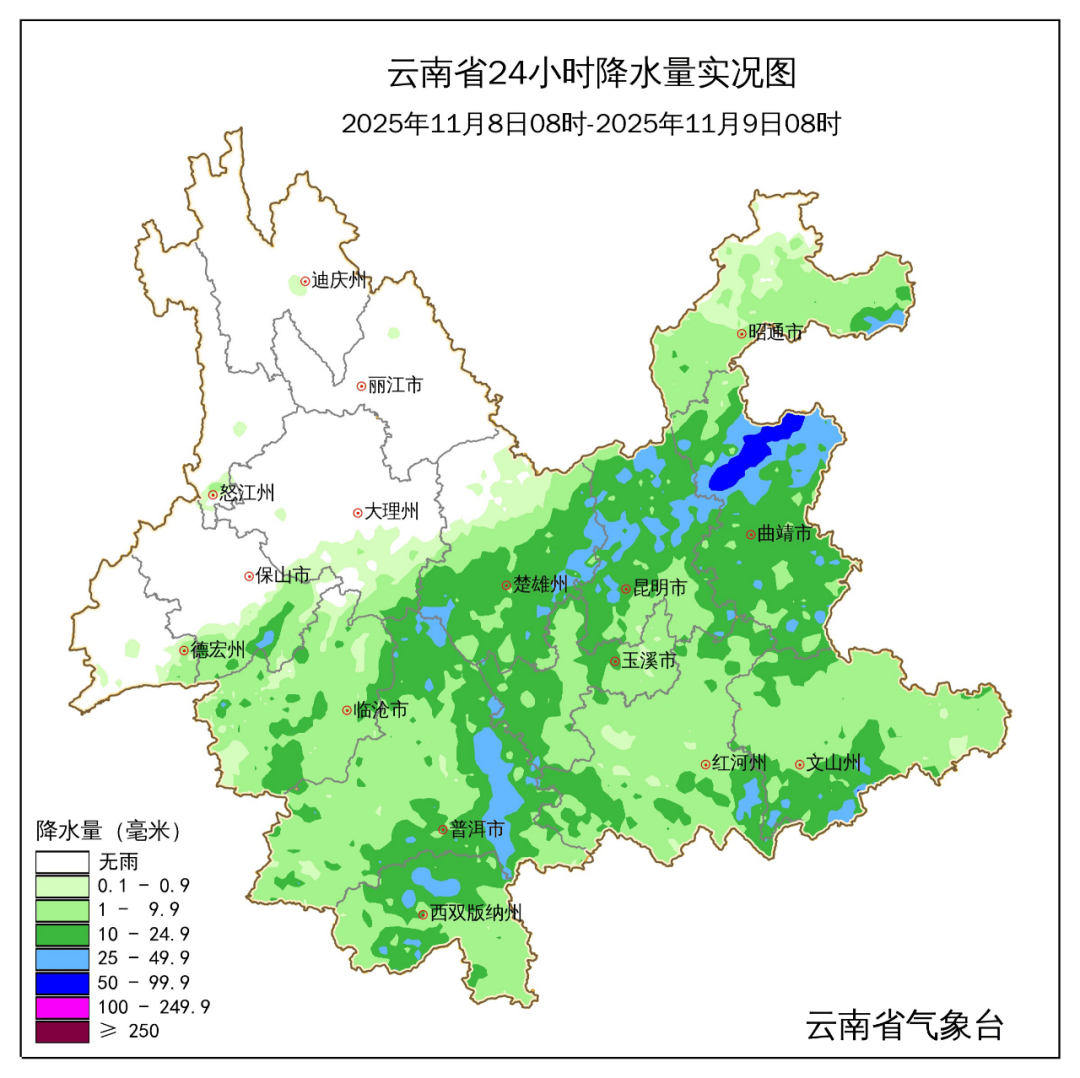 11月9日20时到11月10日20时:曲靖市南部、昆明市南部、玉溪市东部、文山州西部、红河州、普洱市南部、西双版纳州阴有中雨局部大雨、暴雨,昭通市、曲靖市北部、昆明市北部、楚雄州、玉溪市西部、文山州东部、普洱市北部阴有小雨,其他地区多云间晴。