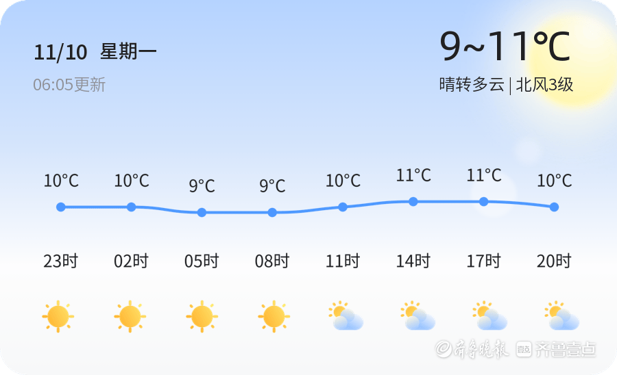今日是11月10日(星期一),农历九月廿一,威海天气晴转多云,气温适中,白天最高气温11℃,夜间最低气温9℃。北风3级,空气湿度39%,PM2.5浓度为20,空气质量优,适合户外活动。市民出行时建议注意防风,随身携带雨具以备不时之需。气温适宜,适合进行日常出行和户外活动。