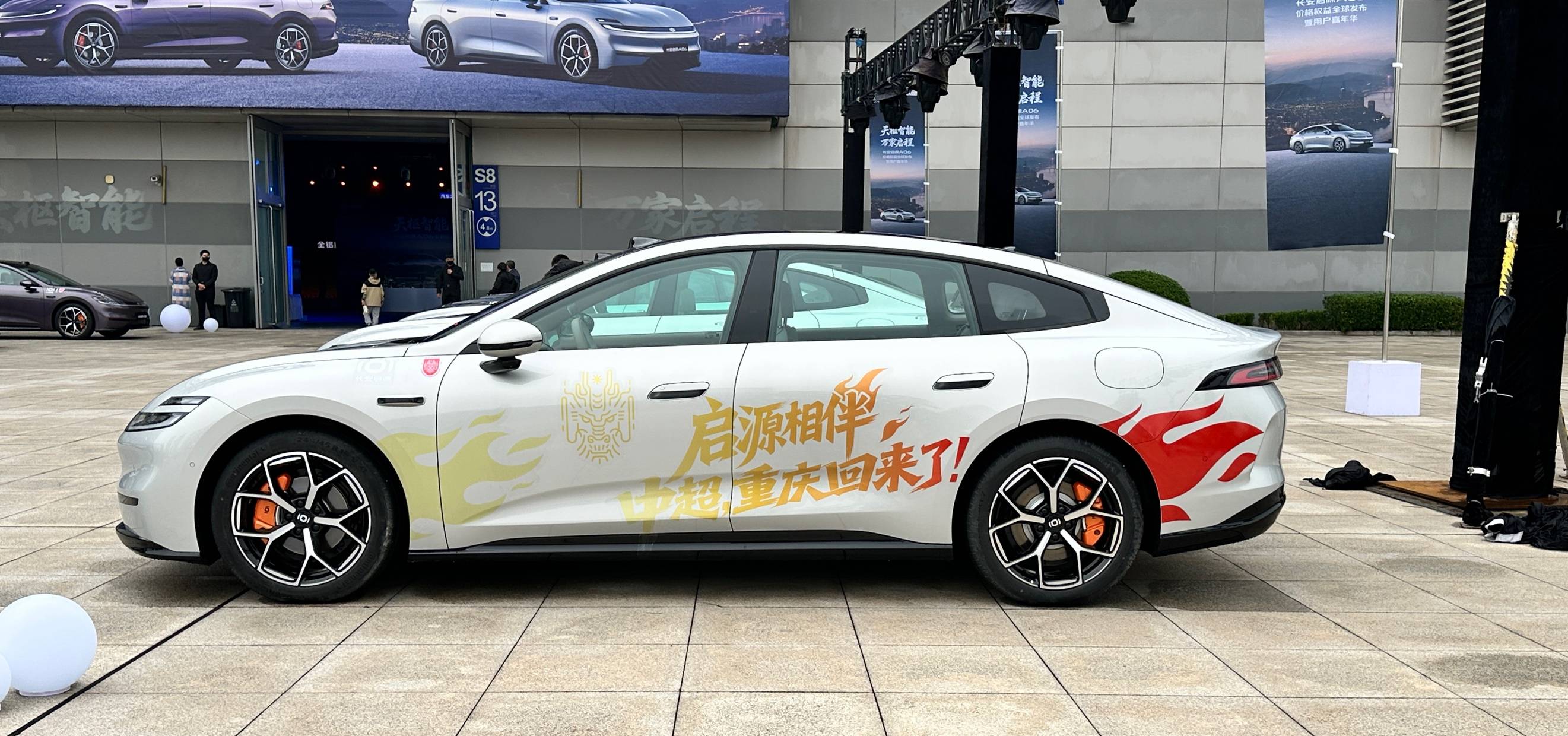 车身侧面,新车前低后高的轿跑姿态搭配流畅的溜背造型,赋予车辆静态下的动感特质。同时,新车侧面采用无腰线设计,依靠曲面张力营造高级感,隐藏式门把手与无边框车门的组合不仅优化视觉效果,更有效降低风阻。门板下方的内凹切割线避免了车身臃肿感,双五辐低风阻轮毂与黑色侧裙相呼应,强化性能气息。部分车型配备的电动升降尾翼,可在行驶中提供下压力。车身尺寸方面,新车长宽高分别为4885/1916/1496mm,轴距为2922mm。