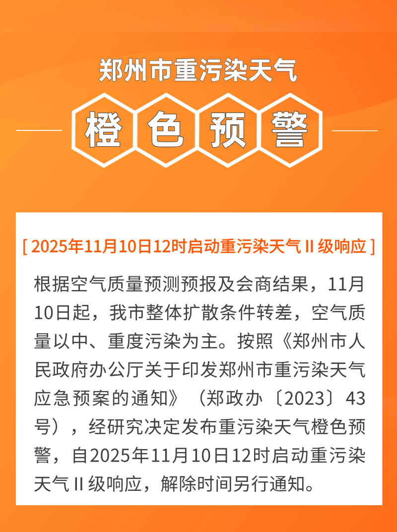 【大河财立方消息】11月10日,据郑州市生态环境保护工作专班污染防治攻坚办公室,根据空气质量预测预报及会商结果,11月10日起,郑州市整体扩散条件转差,空气质量以中、重度污染为主。经研究决定发布重污染天气橙色预警,自2025年11月10日12时启动重污染天气Ⅱ级响应,解除时间另行通知。