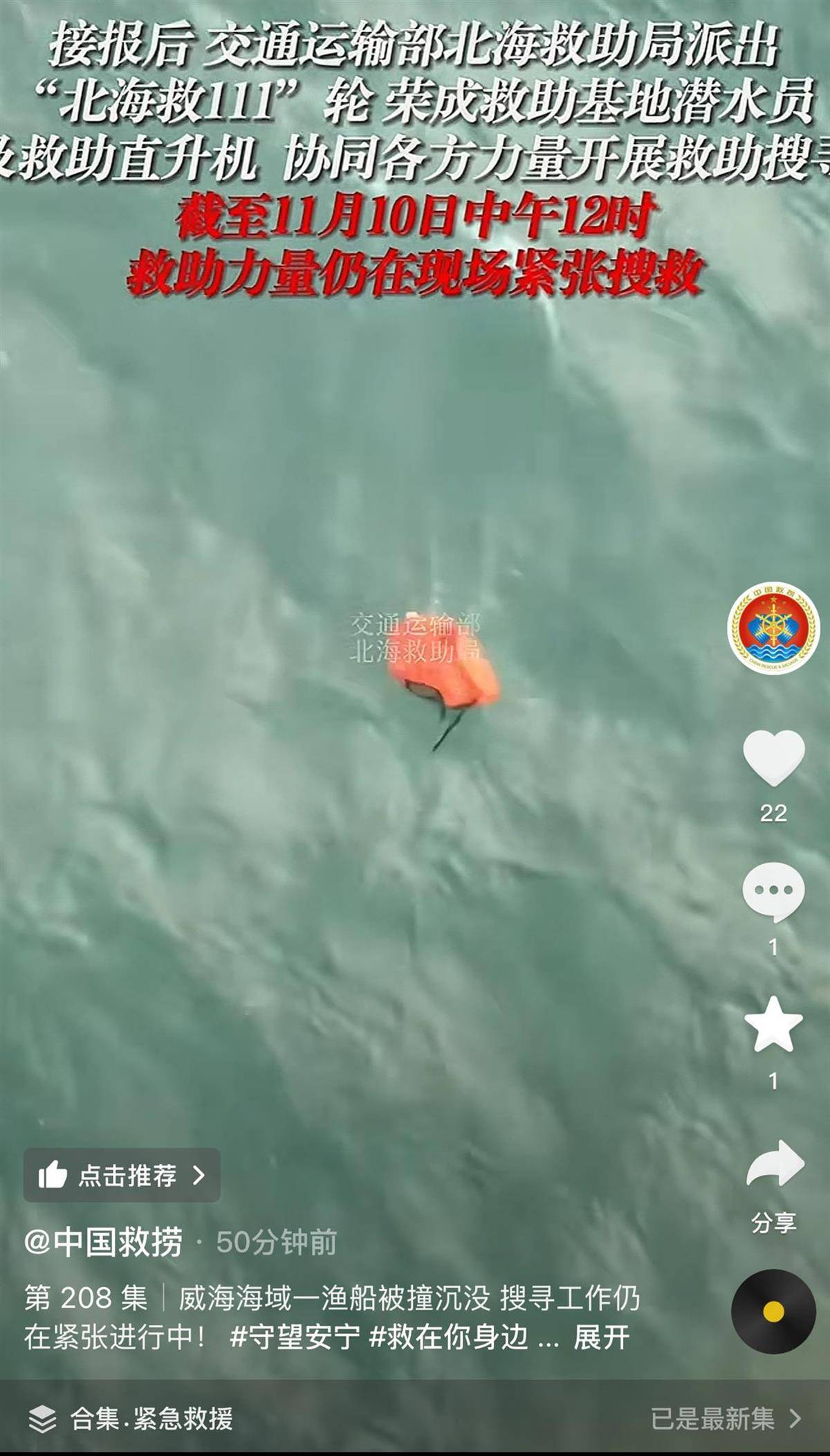 11月10日,交通运输部救助打捞局官方抖音账号“中国救捞”公布了现场救援画面。视频中,船只正在紧张搜救,一件疑似橙色救生衣的物品漂浮在海面。视频字幕称,交通运输部北海救助局派出“北海救111”轮、荣成救助基地潜水员、救助直升机,协同各方力量开展救助搜寻。截至10日中午12时,救助力量仍在现场紧急搜救。