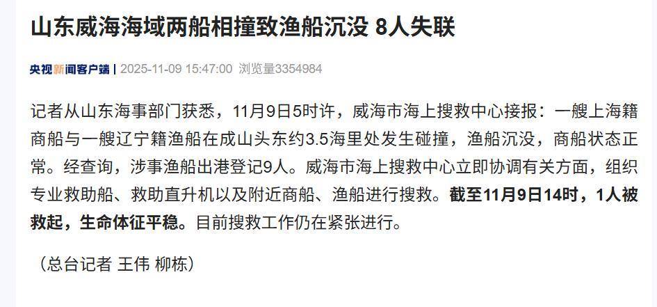 11月9日15时许,央视新闻报道,11月9日5时许,威海市海上搜救中心接报:一艘上海籍商船与一艘辽宁籍渔船在成山头东约3.5海里处发生碰撞,渔船沉没,商船状态正常。经查询,涉事渔船出港登记有9人。威海市海上搜救中心立即协调有关方面,组织专业救助船、救助直升机以及附近商船、渔船进行搜救。