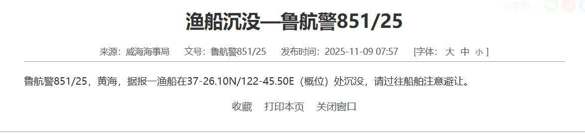 另据中华人民共和国海事局网站,9日7时57分发布信息,称:鲁航警851/25,黄海,据报一渔船在37-26.10N/122-45.50E(概位)处沉没,请过往船舶注意避让。