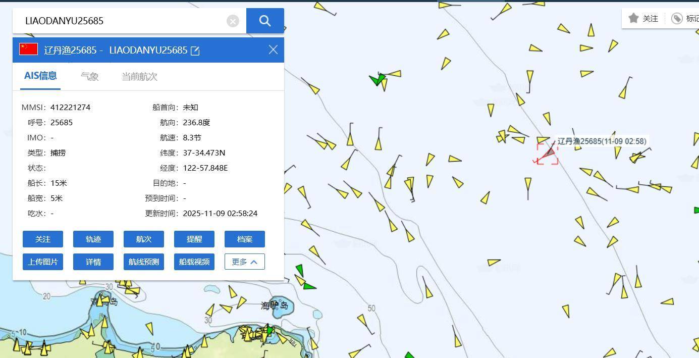 网友小杰(化名)老家位于成山,他告诉记者,山东省地图上,陆地的“小尖”就是成山头,成山头又叫天尽头,成山头附近海域情况比较复杂。记者注意到,有网友有疑问称海面很大为什么会碰撞?对此,小杰向记者解释,在商船上看渔船就像个小蚂蚁一样,海上突发情况很多,船只不像陆地上开车那么灵活。另一名曾做过海员的威海居民告诉记者,沉没渔船为辽丹渔25685,并向记者提供了该渔船在船讯网上的定位信息。据船讯网,辽丹渔25685的定位信息自9日2时58分24秒后不再更新。该居民介绍,一般情况下船讯网上的船只定位信息会实时更新。