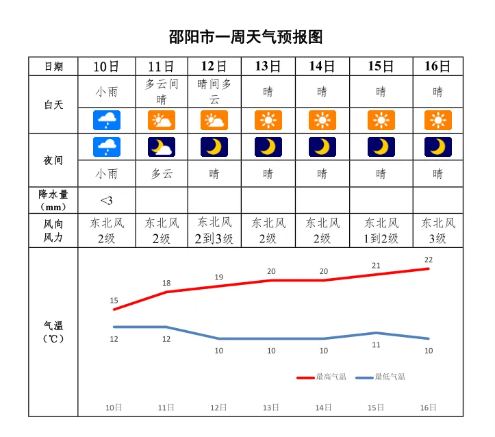 10日:阴天有小雨,东北风2级,气温12~15℃;