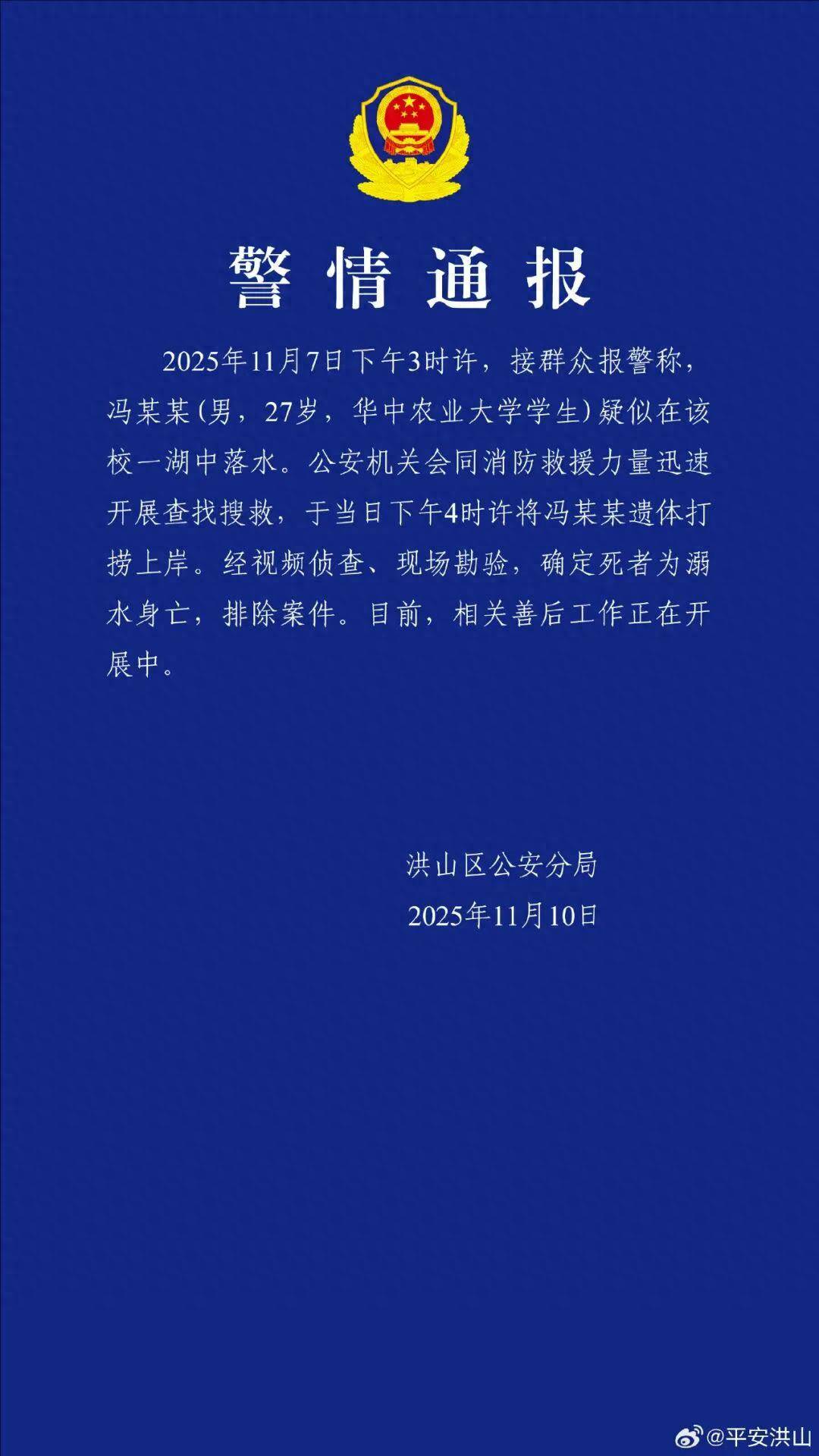 武汉市洪山区公安分局11月10日通报,11月7日下午3时许,接群众报警称, 冯某某(男,27岁,华中农业大学学生)疑似在该校一湖中落水。公安机关会同消防救援力量迅速开展查找搜救,于当日下午4时许将冯某某遗体打捞上岸。 经视频侦查、现场勘验,确定死者为溺水身亡,排除案件。目前,相关善后工作正在开展中。