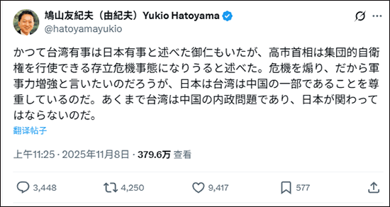 此外,前日本首相鸠山由纪夫也于11月8日在X平台上批评称,“有人曾说‘台湾有事即日本有事’,如今高市首相又称台湾有事可能成为可行使集体自卫权的‘存亡危机事态’。这显然是在煽动危机,为强化军备寻找辩护理由。日本应尊重台湾属于中国的事实,台湾问题完全属于中国内政,日本不应干涉。”