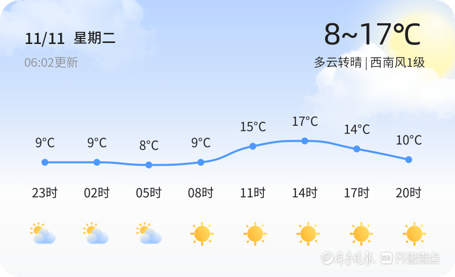今天是11月11日,星期二,农历九月廿二。东营市今日天气多云转晴,气温8℃至17℃,西南风1级,空气湿度73%,PM2.5浓度为78,属于良好等级。良好的空气质量适宜户外活动,但早晨气温较低,建议市民出行时增添衣物,注意保暖。同时,今日阳光充足,适合晾晒衣物和户外运动。
