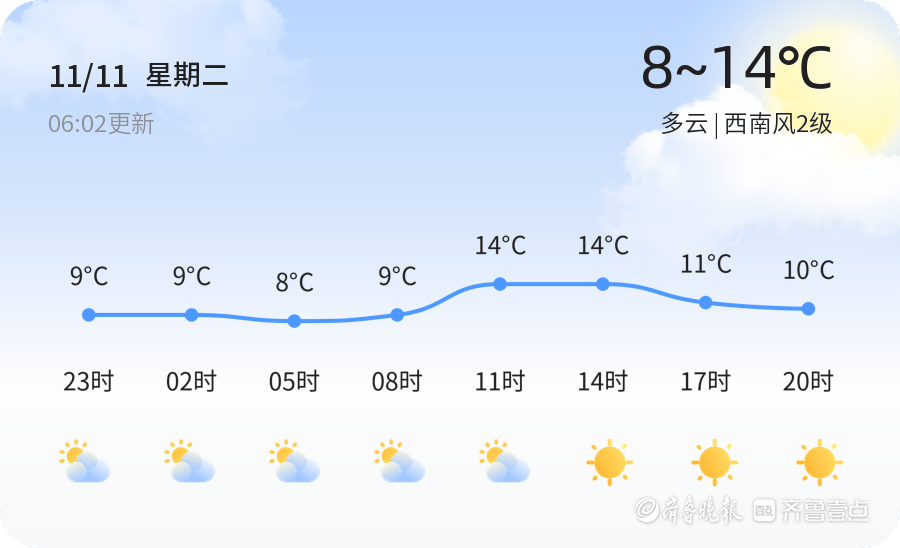 今天是农历九月廿二,烟台市迎来多云天气,气温介于8℃至14℃之间,西南风2级,空气湿度50%,PM2.5指数为51,空气质量良好。全市各区均以多云天气为主,温差适中,适合市民户外活动。