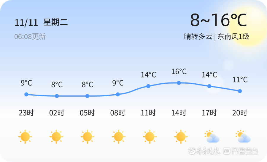 今日是11月11日,星期二,农历九月廿二。菏泽市今日天气晴转多云,气温在8℃至16℃之间,东南风1级,空气湿度为66%,PM2.5指数为61,空气质量良好。各区县天气情况总体平稳,气温适宜,市民出行可享受秋日阳光的温暖。