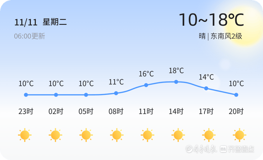 今天是2025年11月11日,星期二,农历九月廿二。济南市今日天气晴朗,气温介于10℃至18℃之间,东南风2级,空气湿度42%,PM2.5浓度为60微克/立方米,空气质量等级为良好。市民朋友们可以放心进行户外活动,但需注意适时增减衣物,防晒补水。建议市民出行时携带轻便外套,以应对气温变化。