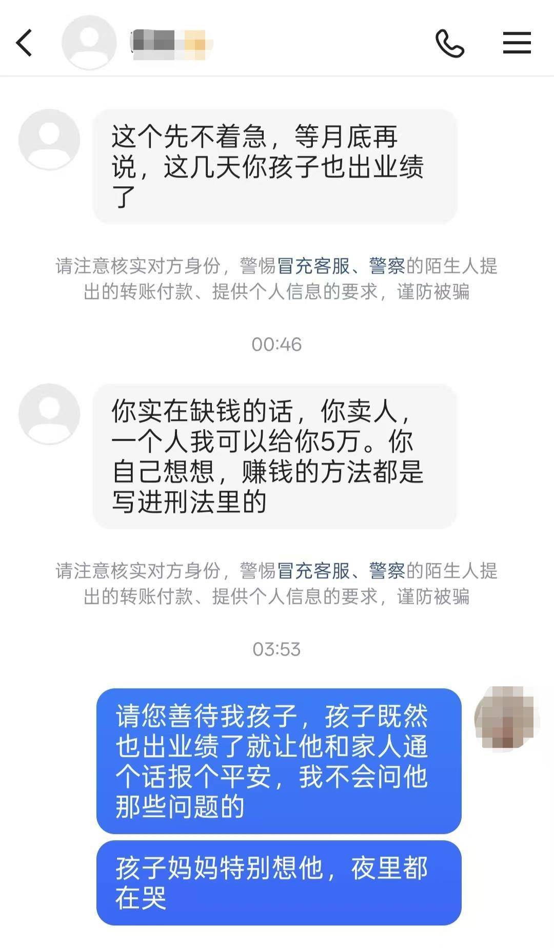 郭先生告诉极目新闻记者,11月3日,他儿子的那个短视频账号突然回复了他,但对方并不是他的儿子,而是一名疑似在园区的人,对方称郭先生如果想要联系上他的儿子,就要再骗过去3个人,“联系完你得给我弄三个人过来,这三个人是你孩子的业绩,三个人来了你孩子就可以回去了”,还说明天准备把他的儿子卖到缅甸,对此郭先生表示他做不到,对方回复说:“我们这缺人,不缺钱”“人都弄不来,你准备好赔付20万,准备好了你和你孩子通话”。郭先生说,他家里老人刚做完手术,实在筹不到这么多钱,对方又表示,实在缺钱可以卖人,一个人给5万元。