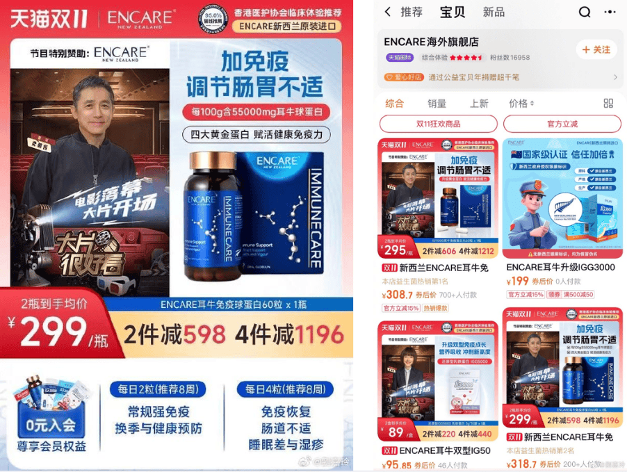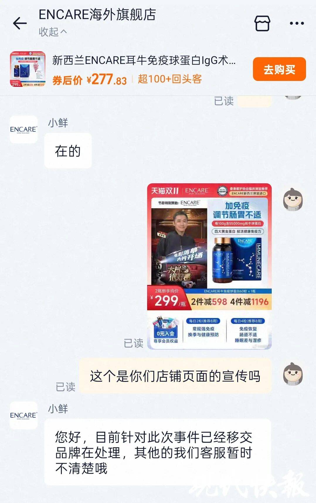 其晒出的图片显示为一家名为“ENCARE海外旗舰店”的店铺,该店铺标识中含“天猫国际”字样,其售卖的产品中,有一款名为“新西兰ENCARE耳牛免疫球蛋白”的商品,商品首页图放置了梁朝伟半身照片。