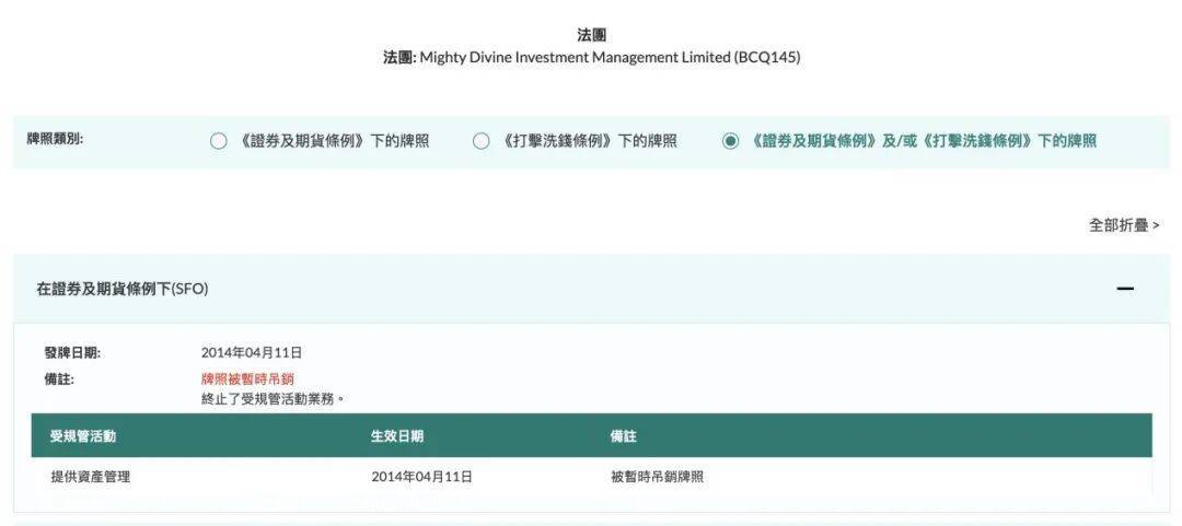 近日,香港证监会与香港保监局也同时出手,对上述三家公司相关牌照采取行动。记者查询中国香港证监会官网发现,Mighty Divine Investment Management Limited和Mighty Divine Securities Limited的牌照均已被处置,显示“牌照被暂时吊销”以及“终止了受规管活动业务”。