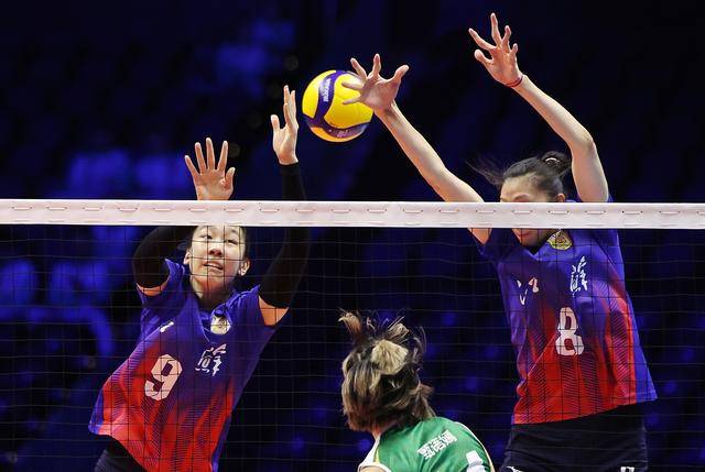 11月10日,江苏队球员万梓玥(左)和吴梦洁(右)在比赛中拦网。新华社记者 陈斌 摄