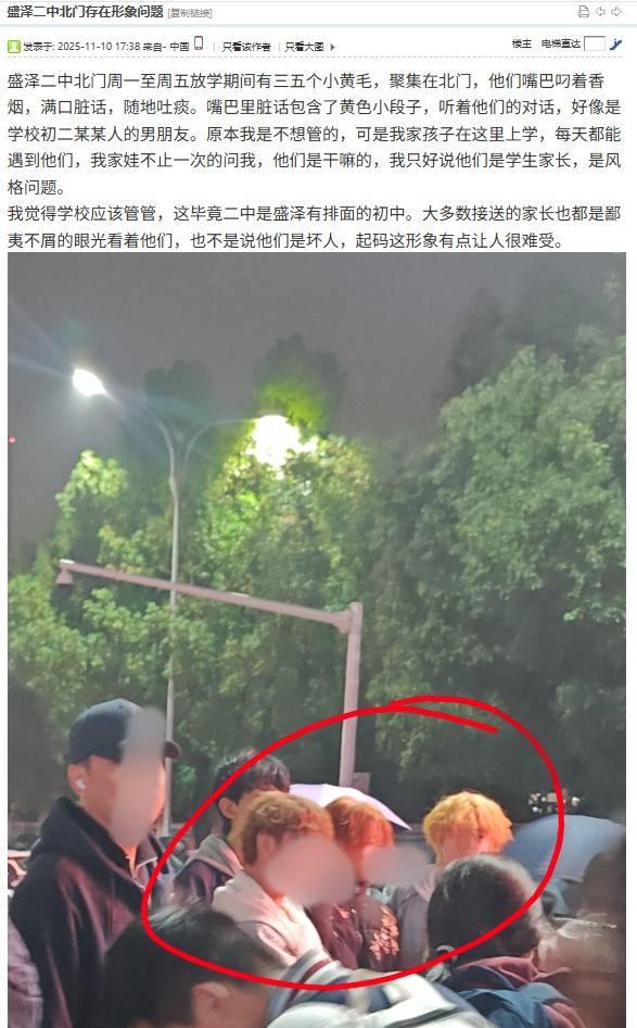 涉事学校是吴江区盛泽二中,是一所公办初中。网友介绍,这些青年放学期间聚集在学校北门,每天接送孩子上学都能看到,“这形象让人很难受,学校应该管管,毕竟二中是有排面的初中。”图片显示,有3个黄头发的男子站在人群中。