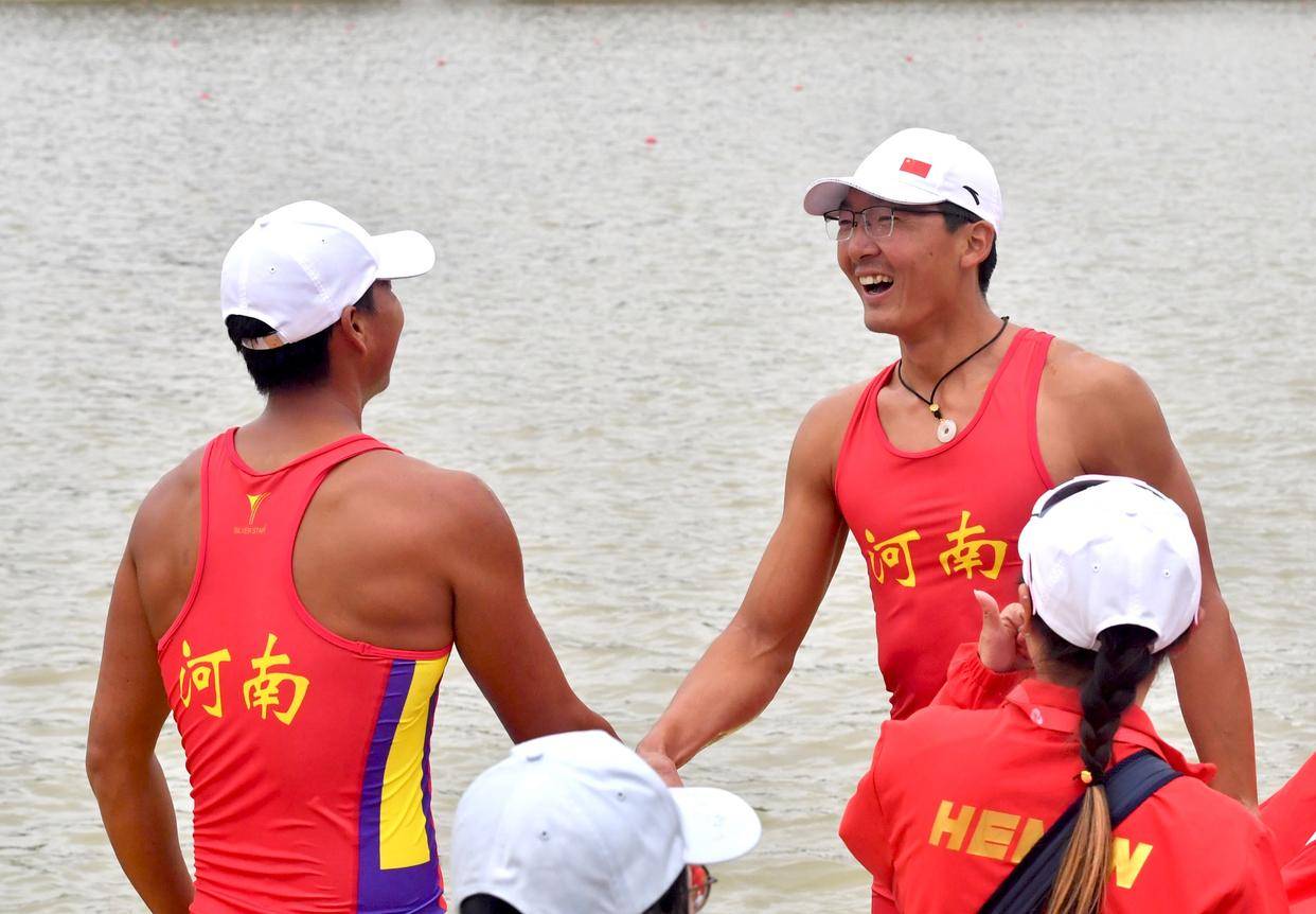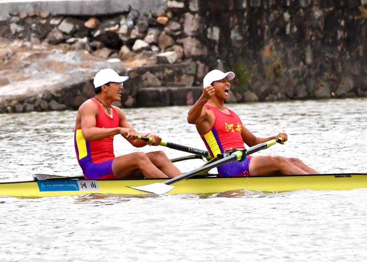 和在前一天夺冠的河南女子四人双桨组合相同,崔兵辉和边世豪这对组合在此前的预赛和半决赛中,也都是连续排名第一。而和前者都是最后阶段逆袭成功不同的是,后者的表现相当强势,都是一路领先,率先撞线。因此,男子双人单桨这个项目,也在赛前被河南代表团认为更有把握。