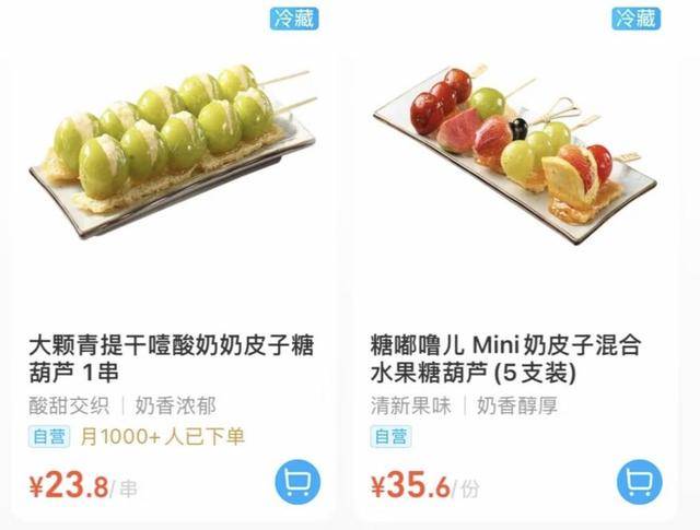 近段时间,大街小巷的零食店纷纷开售奶皮子糖葫芦,盒马鲜生、京东七鲜等即时零售平台也都上架同款,薛记炒货更推出9.9元的奶皮子糖葫芦。