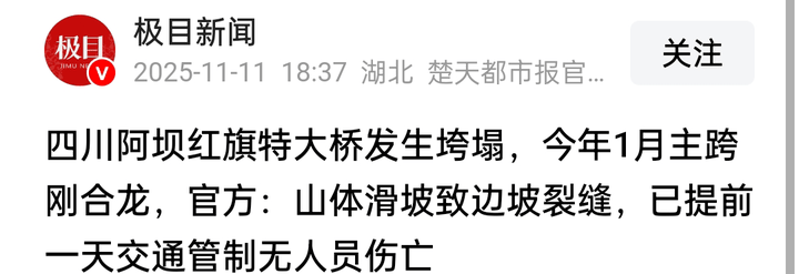消息来源:《红星新闻》11月11日报道《四川阿坝红旗特大桥垮塌》