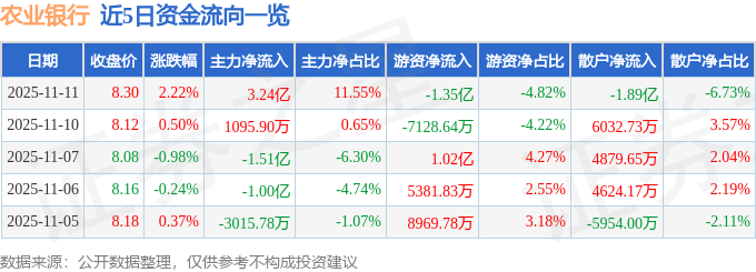 证券之星消息,截至2025年11月11日收盘,农业银行(601288)报收于8.3元,上涨2.22%,换手率0.11%,成交量340.65万手,成交额28.03亿元。
