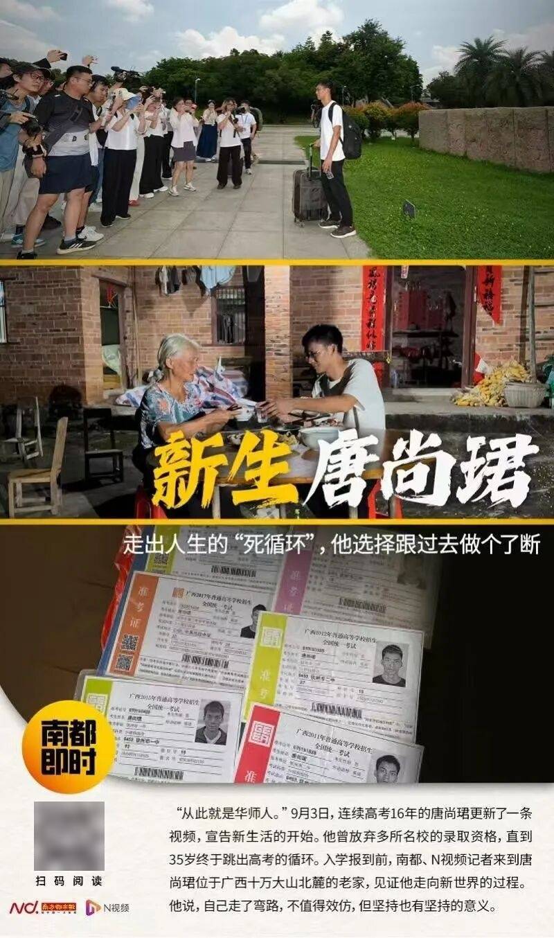 出生于1989年的唐尚珺,在广西防城港的一个偏远山村长大。自2009年第一次参加高考后,心怀名校梦的唐尚珺连年复读备考,其间曾放弃多所名校的录取资格。直到2024年,35岁的他终于跳出高考循环,成为华南师范大学的一名本科新生。