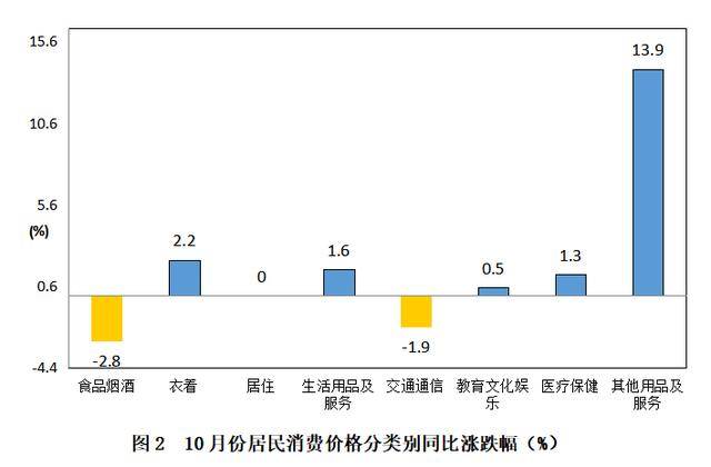 其他七大类价格同比“五涨一降一平”。其中:其他用品及服务、衣着、生活用品及服务、医疗保健、教育文化娱乐价格分别上涨13.9%、2.2%、1.6%、1.3%、0.5%;交通通信价格下降1.9%;居住价格持平。
