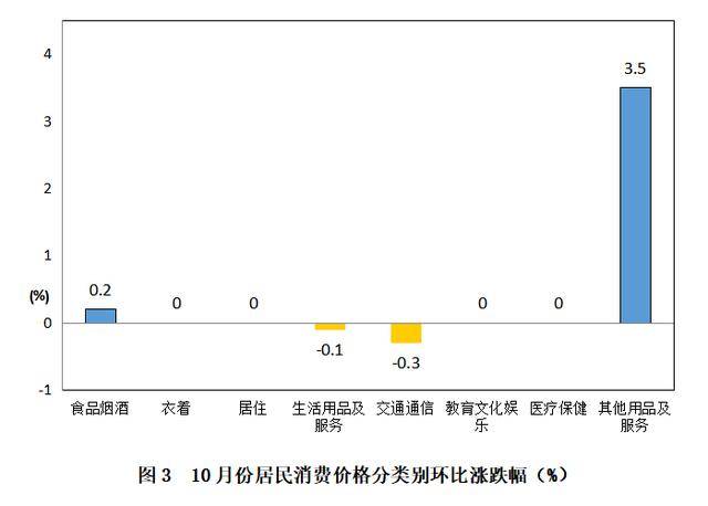 其他七大类价格环比“一涨二降四平”。其中:其他用品及服务价格上涨3.5%;交通通信、生活用品及服务价格分别下降0.3%、0.1%;居住、医疗保健、衣着、教育文化娱乐价格持平。
